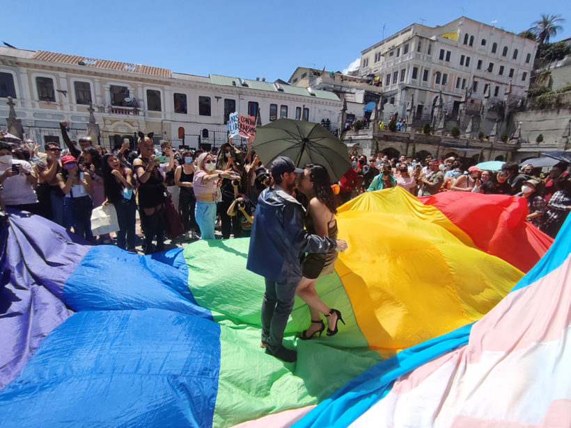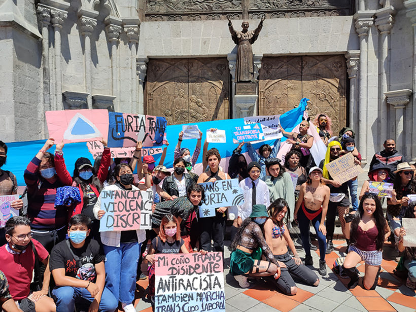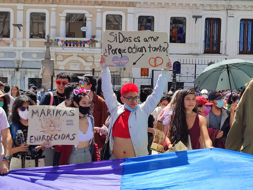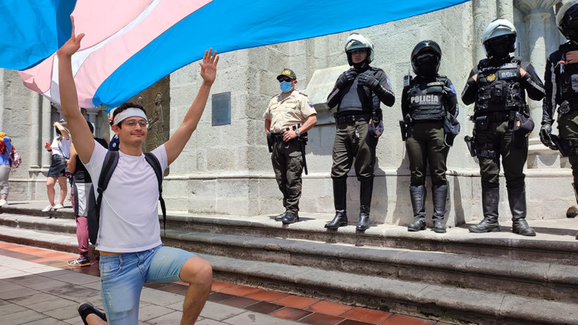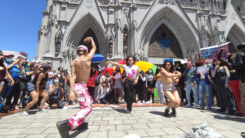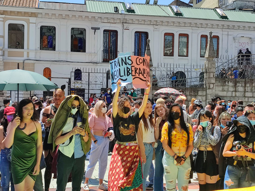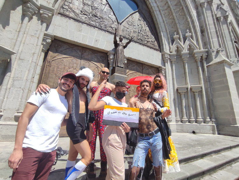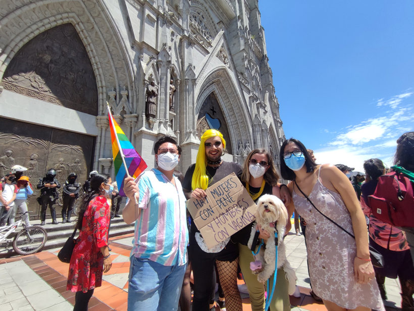 Con abrazos, gritos, bailes, fotos y besos, este domingo 28 de noviembre, la comunidad trans y LGBTIQ+ de Quito, junto a diferentes colectivos y colectivas sociales, le recordaron a la iglesia católica y al Estado nacional que las personas trans tienen los mismos derechos que cualquier ser humano.