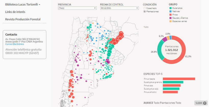 Según datos oficiales actualizados del Ministerio de Agricultura, Ganadería y Pesca de la Argentina, el país posee 1.321.912 hectáreas sembradas con una escasa variedad de árboles entre los que se destaca el pino con un porcentaje del 61,3 % en contraste del 2,5 % de árboles nativos (entre los que se encuentra el pehuén) para la elaboración exclusiva de madera y papel.