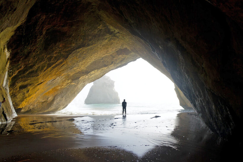Hay grandes cuevas en la pared de piedra. Parecen grutas. Las olas llegan hasta sus “puertas”. Ingreso a investigar, voy entrando, no hay mucha luz. Sigo caminando agachado. El techo es muy bajo, el suelo es de arena fina y seca.