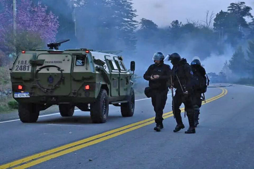 “Nos encontramos las lamgen que fuimos desalojadas esta madrugada del territorio, con los niños: una bebé de un mes, un bebé de cuatro meses y una mujer embarazada. Fuimos gaseadas dentro de nuestras propias casas. Sacadas a la fuerza con nuestros bebés. Golpeadas. Ahora nos encontramos detenidas. Vamos a ser trasladadas a Bariloche”.