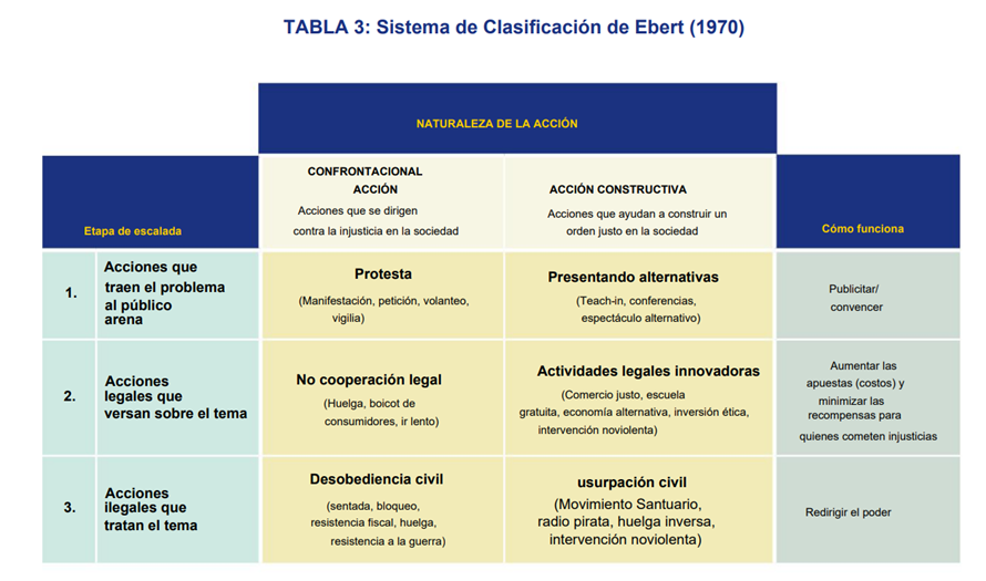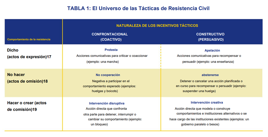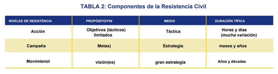 Para poder comprender mejor la Resistencia civil recurre a categorizarla en 3 niveles: acción, campaña y movimiento; como se ve en la siguiente tabla: