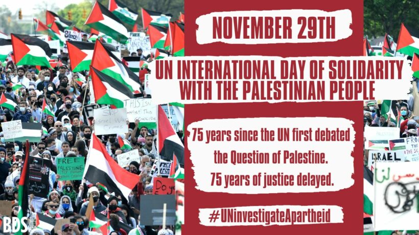 Desde 1977, el 29 de noviembre de cada año, o alrededor de esta fecha, las Naciones Unidas conmemoran el Día Internacional de Solidaridad con el Pueblo Palestino.
