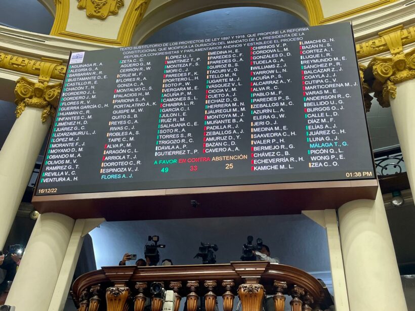 Fueron 33 los legisladores que votaron en contra de esta nueva propuesta de adelanto de elecciones, la cual fue presentada hoy por Hernando Guerra García (Fuerza Popular), presidente de la Comisión de Constitución y Reglamento. La misma planteaba que el mandato de la presidenta Dina Boluarte, del Congreso y de los representantes del Parlamento Andino terminase en abril de 2024.
