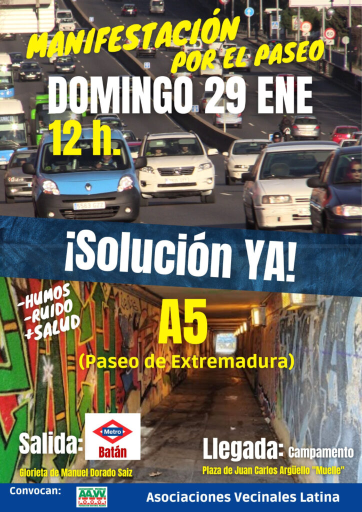 Con el eslogan “¡A5 Solución Ya!”, este próximo domingo 29 de enero, a las 12 horas, está convocada una manifestación para exigir al Ayuntamiento de Madrid que cumpla la promesa electoral de soterrar la A5 (Pº. Extremadura). La misma comenzará en el Metro de Batán y terminará en Campamento (Plaza de Juan Carlos Argüello ‘Muelle’) marchando sobre la A5.