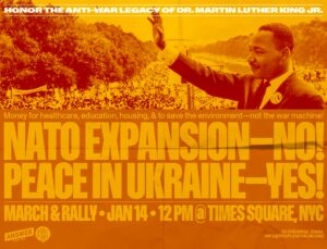 Bajo el lema «¡Sí a la Paz en Ucrania, No a la Expansión de la OTAN» tendrá lugar este Sábado 14 de enero una Marcha por la Paz en Nueva York. Está previsto que los manifestantes se reunan en Times … Sigue leyendo Marcha en Nueva York contra la guerra en Ucrania y la expansión de la OTAN