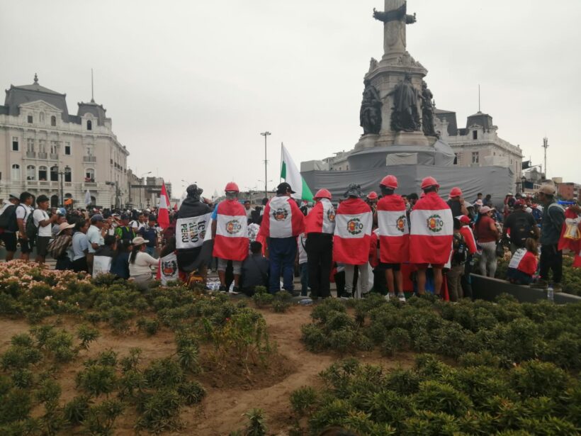 Ese era el plan. Y sin embargo, la Plaza Dos de Mayo “nos tomó”. Nos tomaron cientos de manifestantes de todas las edades, quienes de diversas formas también pedían por el Perú que queremos: adultos mayores, jóvenes universitarios y no universitarios. Todos ponían su “granito de arena” (como decimos humildemente en el Perú): señoras repartiendo la comida para los marchantes, hombres y mujeres cargando aguas hidratantes, universitarios elaborando pancartas, los equipos de salud prestos a apoyar en casos de golpes de calor, asfixia o contusiones; nuestros hermanos del sur ataviados con sus trajes típicos y sus banderas multicolores; nuestros hermanos mineros, con su distintivo casco y, decenas de periodistas alternativos dispuestos a mostrar sin reservas los acontecimientos.