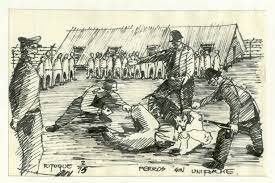 prisioneros tuvimos que presenciar este bestial espectáculo sin movernos siquiera y bajo la tensa vigilancia de nuestros carceleros armados; seguramente esperaban alguna reacción para castigarnos a todos y en todo caso era evidente que pensaban que esta demostración de crueldad y fuerza nos iba a asustar. Los seis prisioneros siguieron trotando cada vez más lentamente, cada vez con más esfuerzo, con cansancio extremo reflejado en sus rostros. Al cabo de media hora, el teniente de los ojos enrojecidos, dio orden de parar; los compañeros fueron llevados a descansar a su “cabaña-celda” y el compañero mordido y herido fue trasladado al consultorio del practicante.