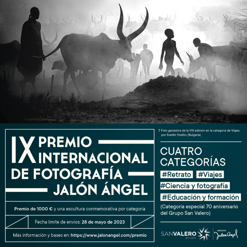 El Archivo Fotográfico Jalón Ángel lanza una nueva edición de su, ya más que consolidado, Premio Internacional de Fotografía Jalón Ángel. La categoría especial de este año es Ciencia y Fotografía, que se une a las ya veteranas Viajes y Retrato. Además, con motivo del 70 aniversario del Grupo San Valero, se incluye una cuarta categoría: Educación y Formación, en honor a las décadas que lleva el Grupo formando. La fecha límite de admisión de las obras es el 28 de mayo de 2023. Las participaciones se realizan online a través de la página web (www.jalonangel.com) y del siguiente enlace: http://www.jalonangel.com/premio/.