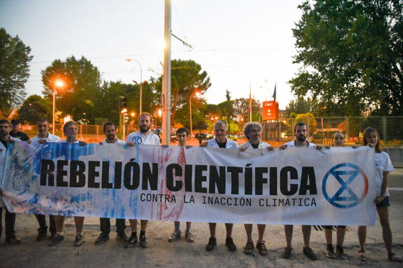 - El movimiento internacional Rebelión Científica / Scientist Rebellion ha organizado hoy una acción de desobediencia civil noviolenta en Madrid para oponerse al negacionismo de la extrema emergencia climática que ha sido bloqueada por la policía, siendo los miembros del colectivo retenidos e identificados por la policía.