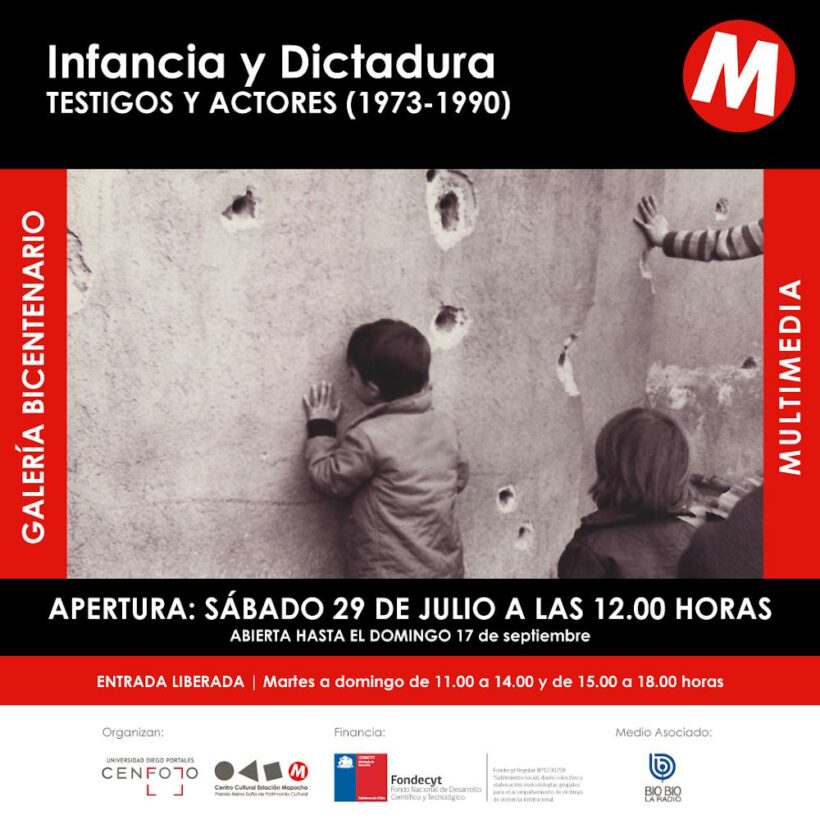 Entre el 29 de julio y el 7 de septiembre, se llevará a cabo la exposición “Infancia/dictadura: testigos y actores (1973-1990)”, que incluye dibujos, textos personales, objetos, prensa, fotos y videos que muestran la cotidianidad de niños y niñas en dictadura y su comprensión de la época en que les tocó crecer; y que estará abierta a todo público en el Centro Cultural Estación Mapocho.