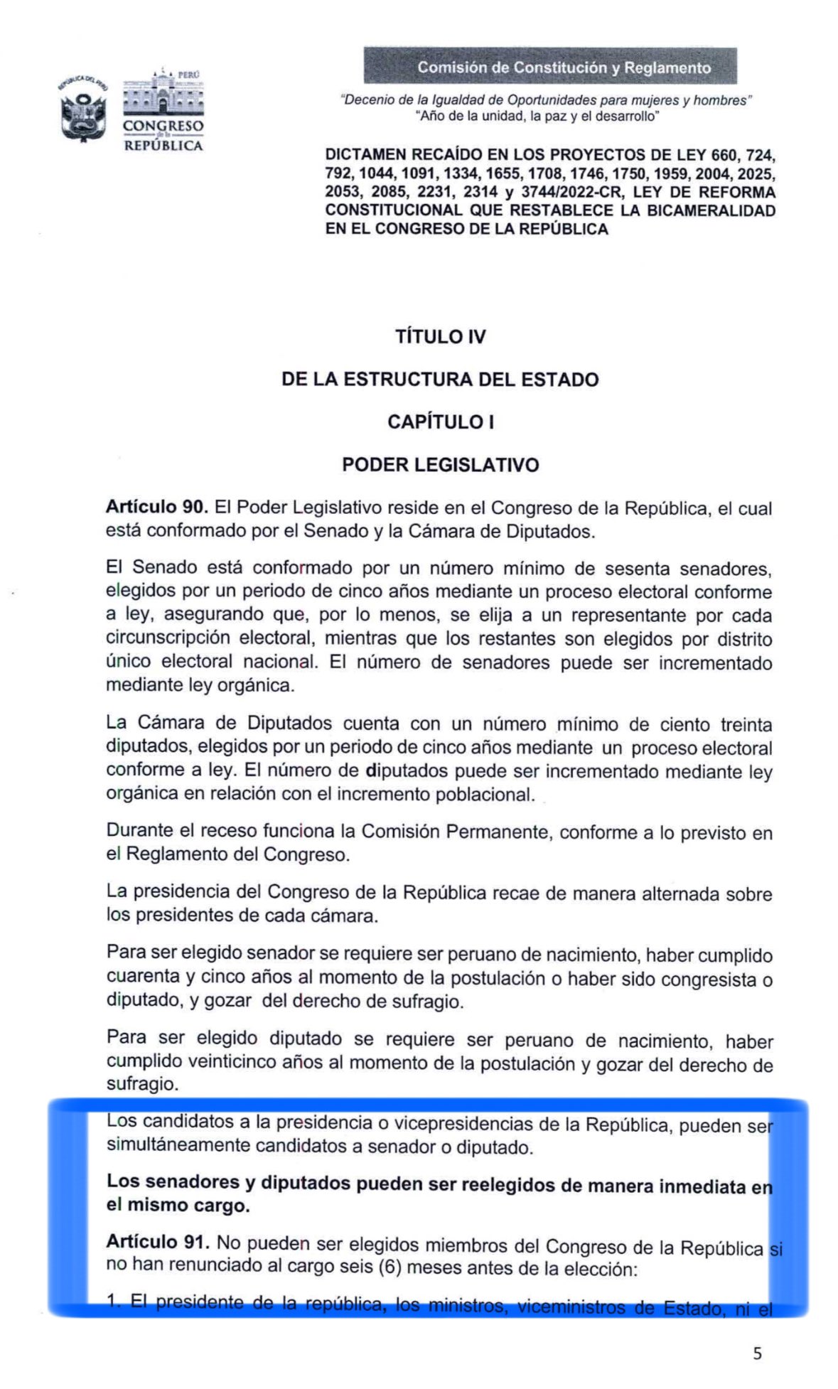 Además, contempla el retorno de la reelección parlamentaria directa al señalar al final del artículo 90 que los “senadores y diputados pueden ser reelegidos de manera inmediata en el mismo cargo”.