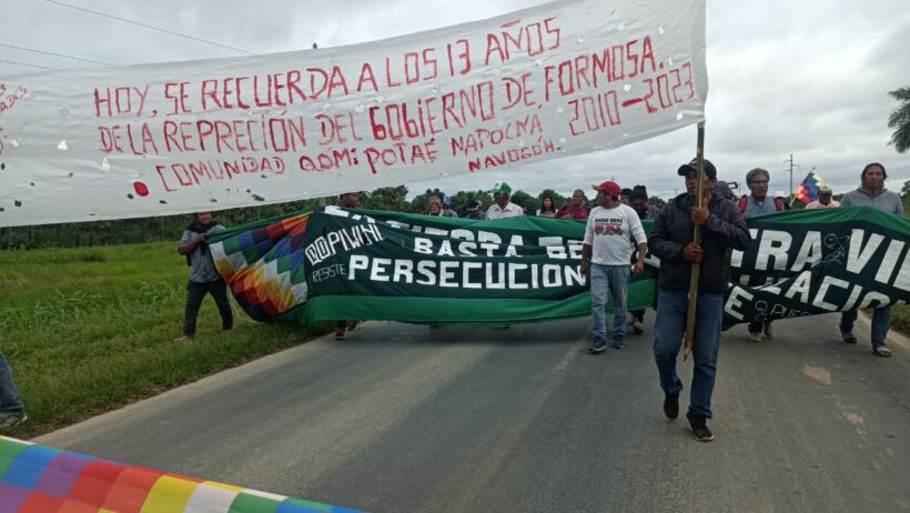 La marcha estaba encabezada por una gran pancarta que donde se podía leer: “La tierra es nuestra vida. Basta ya de judicialización, persecución y muerte a los pueblos originarios”. En otra se podía leer “Hoy se recuerda los 13 años de la represión del gobierno de Formosa 2010-2023”. En todo momento también ha estado presente en sus corazones el hermano asesinado.