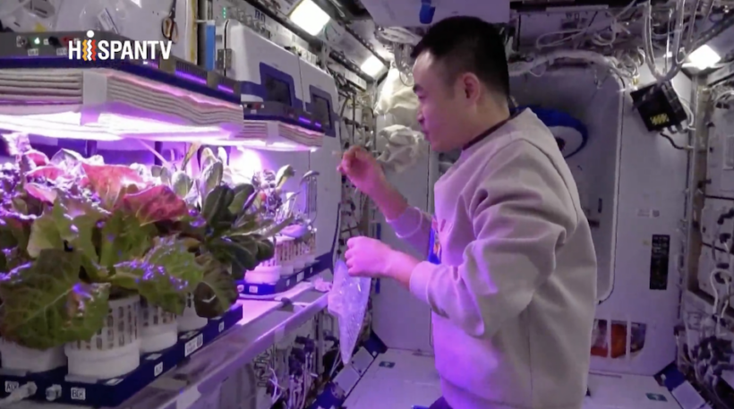 Después de completar las tareas asignadas para el primer día del nuevo año, los astronautas chinos se vistieron con sudaderas con capuchas especiales y encendieron las cámaras para grabar sus actividades en el espacio el día de Año Nuevo. Uno de los tres tripulantes, Tang Shengjie, tomó parte de su tiempo para revisar su cosecha.