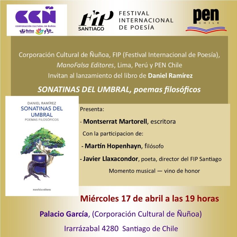 Este miércoles 17 de abril, a partir de las 19 horas, la Corporación Cultural de Ñuñoa y FIP (Festival Internacional de Poesía) realizarán el lanzamiento del libro «Sonatinas del Umbral. Poemas