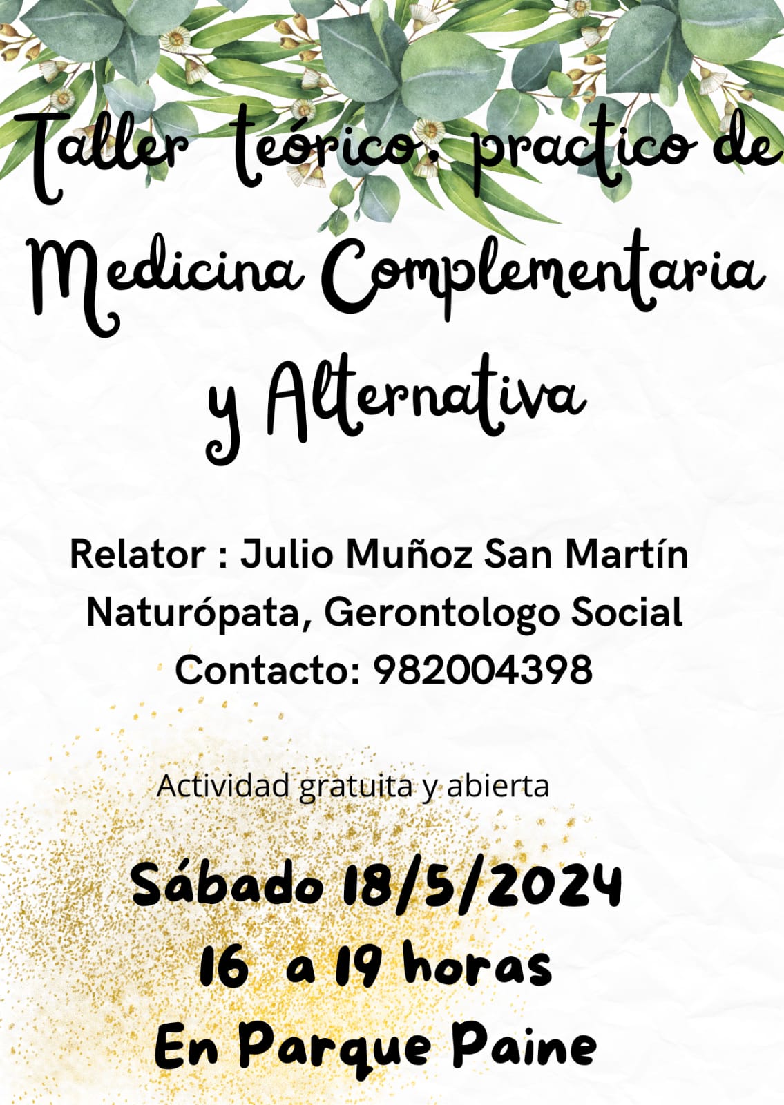 Sábado 18: Taller de Teórico-Práctico de Medicina Complementaria y Alternativa, impartido por Julio Muñoz San Martín, Naturópata y Gerontólogo Social. PRESENCIAL Y GRATUITA, de 16 a 19 hrs.