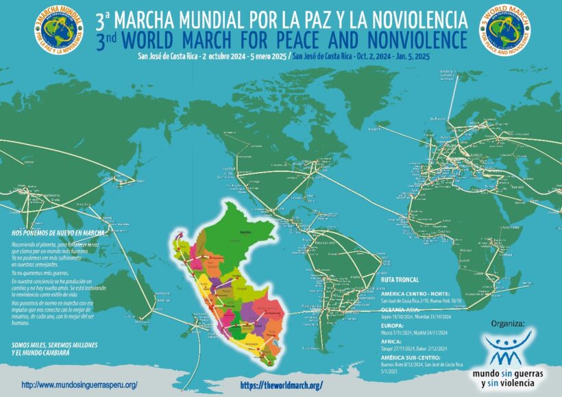 La NOVIOLENCIA se abre a la ciudadanía y a la sociedad peruana cada vez con más fuerza desde aquella Primera Marcha Mundial Por la Paz y la Noviolencia Activa del año 2009–2010. Buscamos ahora, con esta Tercera Marcha Mundial por la Paz y la Noviolencia, difundir como instrumentos y como estrategias de acción cívica, la PAZ y la NOVIOLENCIA ACTIVA, pues, aunque estemos viviendo en esta parte del mundo en paz, vivimos también con violencias en el plano individual, institucional y social, donde se hace cada más necesaria una intervención Pacífica y Noviolenta. Por eso estamos en marcha.