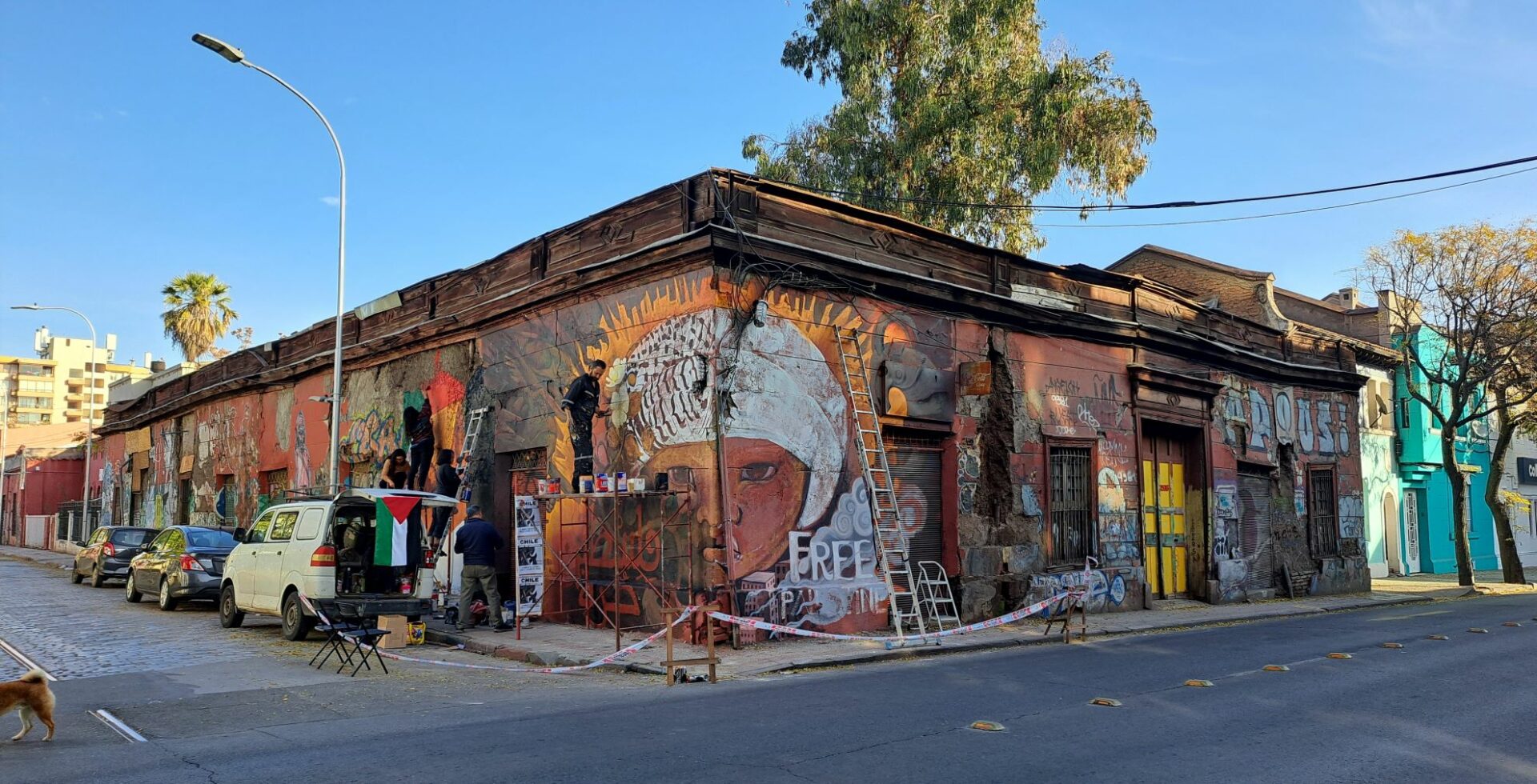 En plena esquina de Compañía con García Reyes, en el Barrio Yungay, un grupo de activistas están pintando a todo ritmo desde anoche un mural en apoyo al pueblo palestino, uniéndose a las miles de manifestaciones en Chile y todo el planeta en rechazo al genocidio de este pueblo por parte del gobierno sionista israelí de Benjamin Netanyahu.