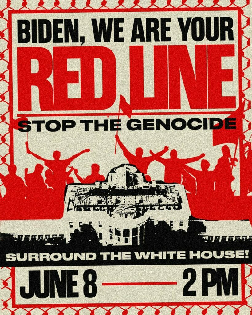 Decenas de miles de personas se unieron a una movilización nacional para rodear la Casa Blanca el 8 de junio y exigir al presidente de Estados Unidos, Joe Biden, que cumpla sus promesas y suspenda toda ayuda a Israel. Los organizadores declararon que, a pesar de que Biden declaró que la invasión de Rafah era una línea roja para la ayuda a Israel, semanas después de la invasión asesina de Rafah por parte de Israel y de la ampliación de los ataques israelíes en toda Gaza, la línea roja de Biden no aparece por ninguna parte.
