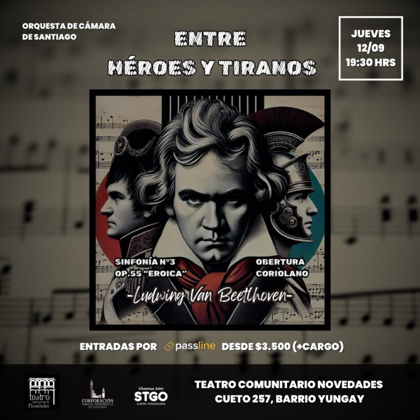 #EntreHeroeYTiranos #OrquestaDeCamaraDeSantiago #ConciertoDeBeethoven #MusicaClasica #TeatroComunitarioNovedades #CulturaChilena #EventosSantiago #Beethoven #MúsicaEnVivo #OrquestaSantiago #SinfoniaEroica #coriolano