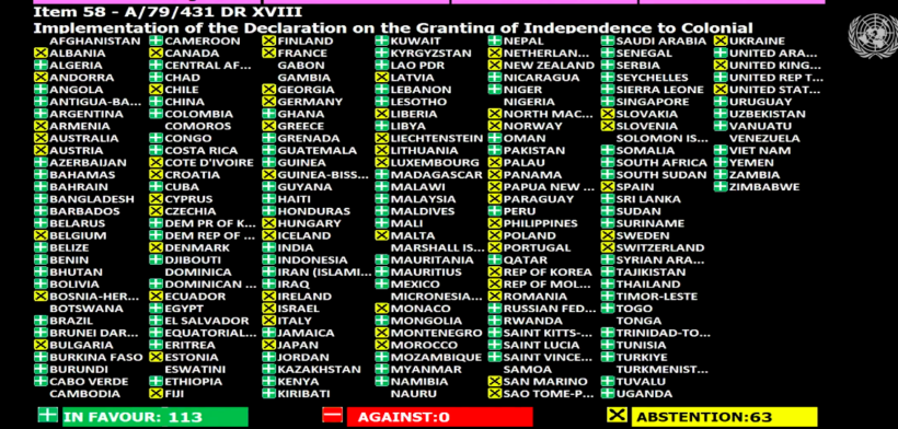 El recién pasado 4 de diciembre se votó, en sesión plenaria de la Asamblea General de las Naciones Unidas, la aplicación de la declaración sobre la concesión de la Independencia de los pueblos y países coloniales, publicado como documento A/79/43, con el título “Implementación de la declaración sobre la concesión de la independencia de los pueblos y países coloniales, erradicación del colonialismo en todas sus formas y manifestaciones”.