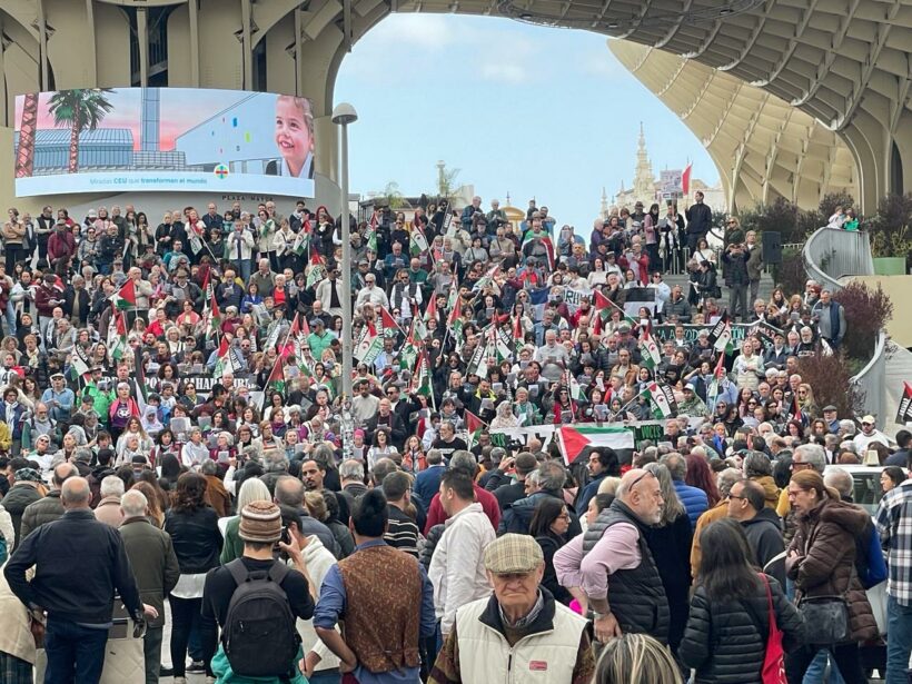 Este domingo 16 de febrero a las 12, se han reunido Mil voces por la paz en Las Setas, de Sevilla, un lugar emblemático de reivindicaciones en la capital andaluza.