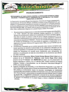 “Recordamos que la Educación Intercultural Bilingüe (EIB) es un derecho esencial que busca preservar nuestra identidad cultural, el uso de las lenguas originarias y nuestra cosmovisión. Es fundamental que los niños, niñas, adolescentes y jóvenes indígenas asistan a instituciones educativas interculturales. No obstante las medidas promovidas por el Legislativo y el Ejecutivo generan una grave afectación en la pervivencia de nuestras lenguas, culturas y desarrollo Integral” señala en un comunicado la OMABINOAP.