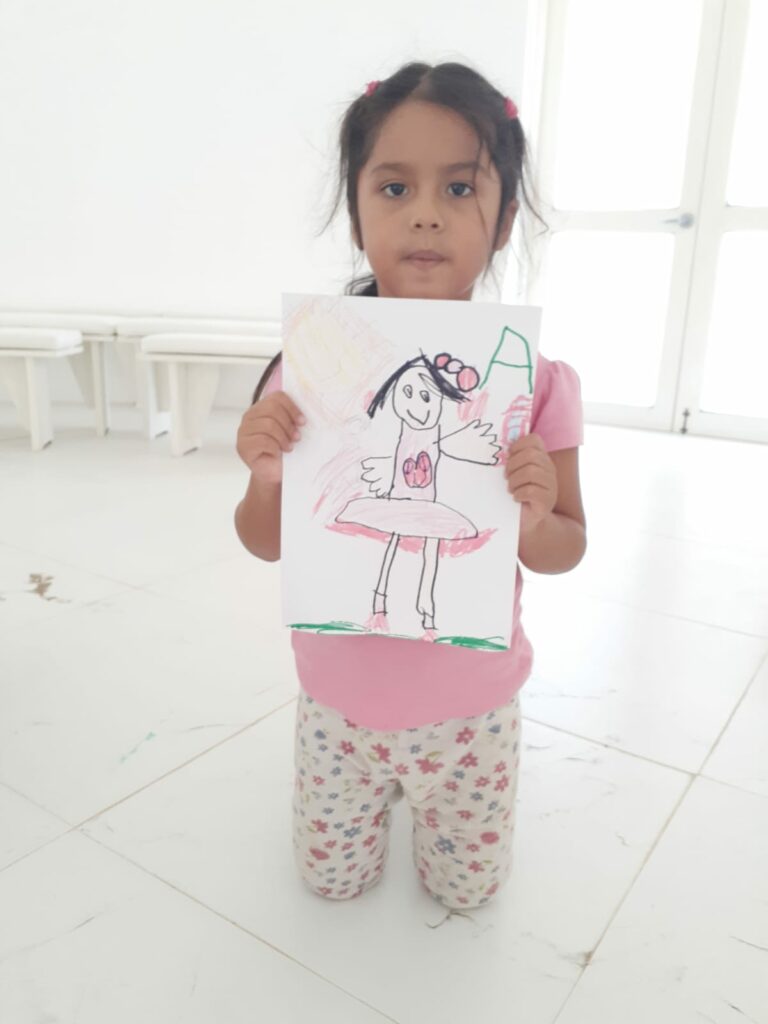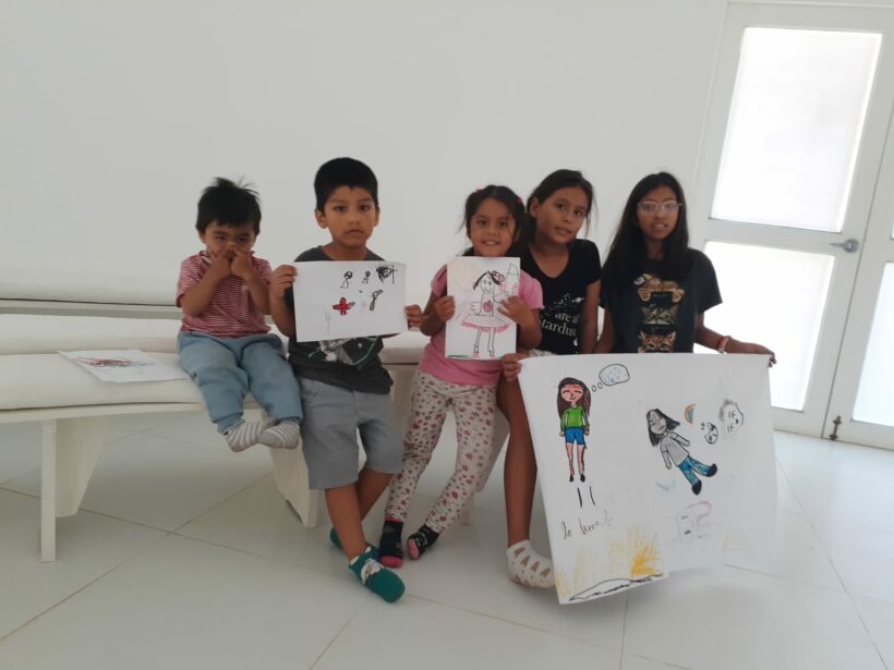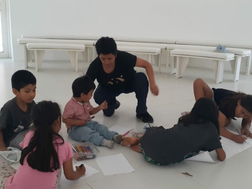 Posteriormente se abrieron dos espacios de talleres paralelos, uno sobre Herramientas para la vida cotidiana: posturas, respiración, el pedido y el agradecimiento con las personas interesadas. El otro taller, que congregó a los niños, fue sobre la experiencia de paz. Los niños jugaron con las burbujas, hicieron la experiencia de paz y concentraron este contacto interno en dibujos. Al final de la experiencia estaban calmados y felices.