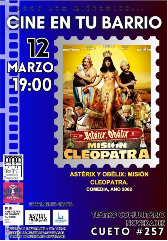 Este miércoles 12 se proyectará de manera gratuita la película «Ásterix y Obelix: Misión Cleopatra«, dentro del ciclo de cine francés del ya tradicional Cine en tu Barrio en el Teatro Comunitario Novedades de Santiago de Chile.