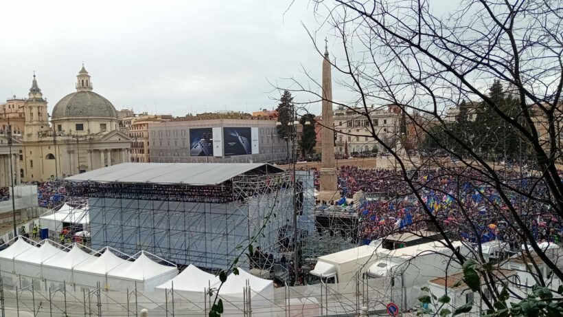 Llegar a la Piazza del Popolo es difícil, rodeada como está por al menos dos cordones policiales que disuaden a los ciudadanos de acercarse porque la plaza, dicen, ya está llena. Y de hecho las vías de acceso están congestionadas, pero desde la terraza del Pincio, desde donde la policía siempre prohíbe asomarse, está claro que en realidad hay sitio, incluso para acceder. También se puede ver la cubierta del enorme escenario que ocupa un cuarto de plaza repleta hasta lo inverosímil, ¡incluso las paredes de la fuente de via D’Annunzio! Banderas azules ondeando junto a las ucranianas, un escenario equipado con tres megapantallas, uno se pregunta: ¿quién patrocina todo esto?