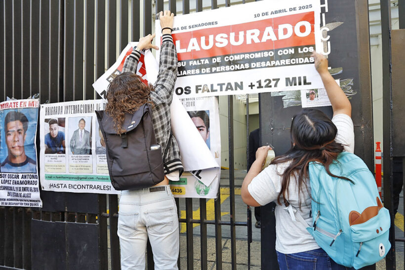 Los familiares de víctimas también colocaron cientos de fichas de búsqueda y fotografías de sus seres queridos en los muros del Senado y en el suelo frente a la sede, en reclamo a la falta de atención de las autoridades para resolver los más de 124 mil casos de desaparición registrados en México.