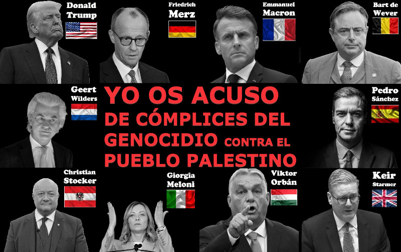 Por las mismas razones, al estadounidense Donald Trump, al alemán Friedrich Merz, al francés Emmanuel Macron, al belga Bart de Wever, al holandés Geert Wilders, al austríaco Christian Stocker, a la italiana Giorgia Meloni, al húngaro Viktor Orbán, al inglés Keir Starmer y al español Pedro Sánchez, entre otros, yo os acuso de cómplices del genocidio contra el pueblo palestino.