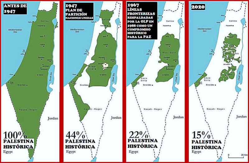 Desde que Naciones Unidas cometió el error de efectuar el Plan de Partición en 1947, repartiendo el territorio histórico palestino entre lo que sería el Estado de Israel y Palestina, el pueblo palestino ha sido despojado gradualmente de sus tierras, quedando reducidas a un 15% de lo que ocupaban antes de la partición.