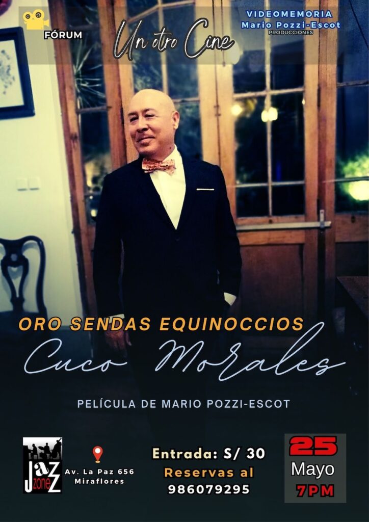 | Este domingo 25 de mayo a las 7:00 p.m., el Jazz Zone de Miraflores (Av. la Paz 656) será el escenario del esperado estreno de “Oro Sendas Equinoccios. Cuco Morales”, el más reciente trabajo documental del cineasta Mario Pozzi-Escot. La cinta propone una inmersión sensorial y profundamente íntima en el universo del artista plástico Cuco Morales, en un recorrido donde la imagen se convierte en lenguaje, y la pintura en memoria viva.