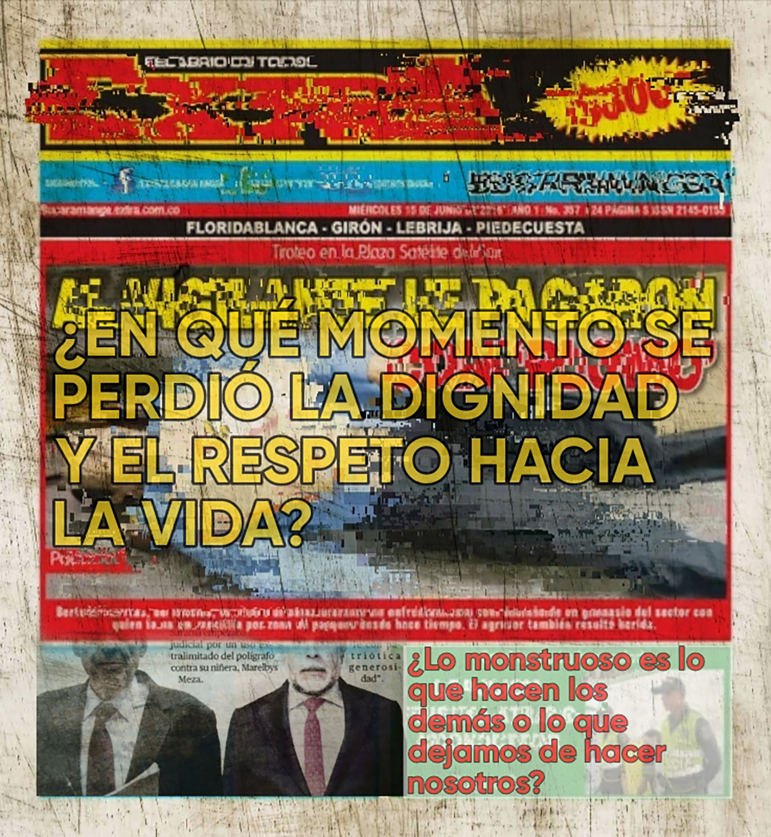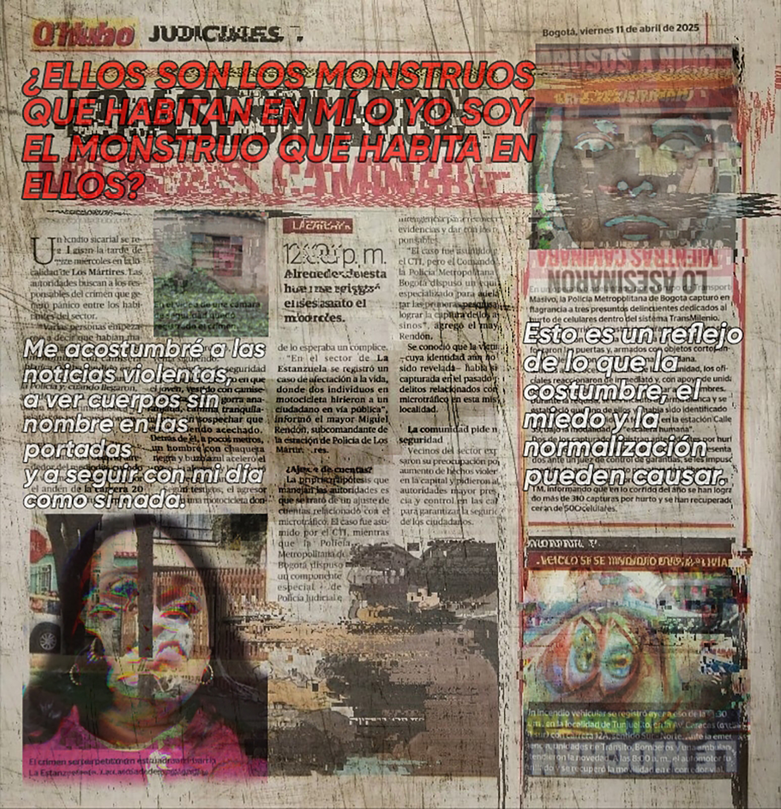 ¿Cuál ha sido el monstruo que ha habitado mi contexto? La respuesta es la prensa, específicamente el periódico Q’hubo, un medio muy conocido en los barrios populares por sus noticias y tragedias con titulares que manejan un tono crudo y vulgar. Lo elegí más que todo por lo que encubre, una realidad que se muestra como producto o mercancía, en donde convierte las historias y el dolor ajeno en un tipo de entretenimiento barato, burdo, pero sumamente lucrativo y que a nosotros nos gusta consumir.