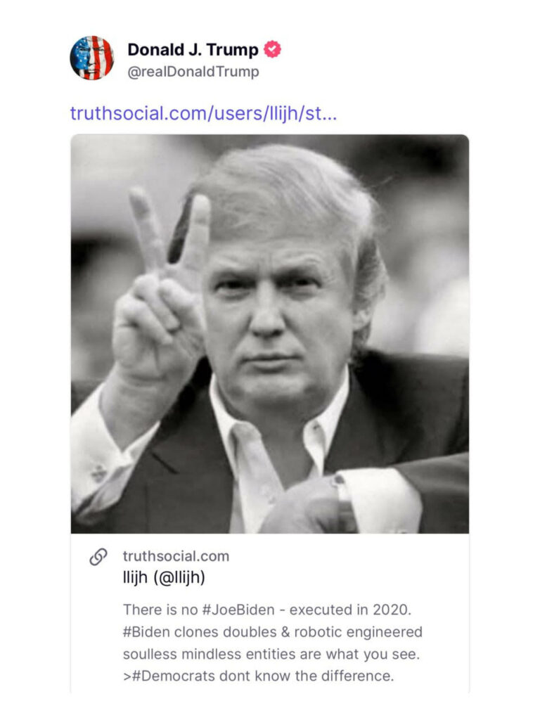 El presidente estadounidense Donald J. Trump lo ha hecho de nuevo. Esta vez no fue con teorías sobre elecciones robadas, ni con consejos para inyectarse desinfectante. No. Esta vez fue más lejos. El pasado 1 de junio de 2025, desde su cuenta verificada en Truth Social, Trump compartió una publicación de un usuario marginal donde se aseguraba, sin matices, que Joe Biden fue ejecutado en 2020 y reemplazado por «clones, dobles y entidades robóticas sin alma ni mente». Y él lo compartió sin comentario alguno, como quien recomienda un buen vino.