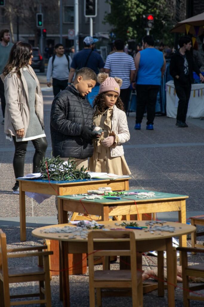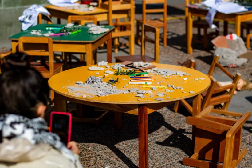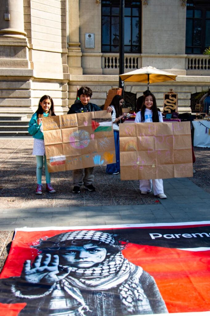 Este 10 de agosto por la mañana, en el Día Internacional del Niño, el colectivo Coordinadora por Palestina realizó una remecedora instalación en el frontis del Museo Nacional de Bellas Artes de Santiago de Chile: una sala de clases bombardeada, con un pizarrón en árabe y la grabación de una clase, bajo una pancarta en que se leía: “Israel mata a 28 niños, un curso, todos los días desde el 7 /10 / 2023”. Posteriormente desplegaron un lienzo con la imagen de un niño envuelto en un pañuelo palestino (keffiyeh) diciendo: “Paremos el genocidio palestino. PALESTINA LIBRE”.