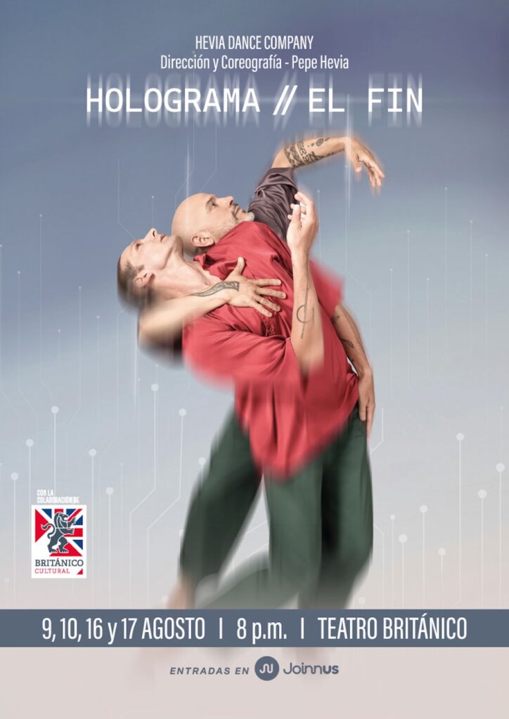 HOLOGRAMA / EL FIN , la más reciente obra del coreógrafo y director Pepe Hevia interpretada por la Hevia Dance Company, se estrena el sábado 9 de agosto en el Teatro Británico, en una breve temporada que va en funciones de 8 pm. hasta el 17 de agosto. Con la esencia sugestiva, simbólica y poética que caracteriza a la compañía, esta nueva creación de danza contemporánea, explora la transformación del ser humano en la era digital, donde la existencia se deconstruye entre lo tecnológico y lo carnal.