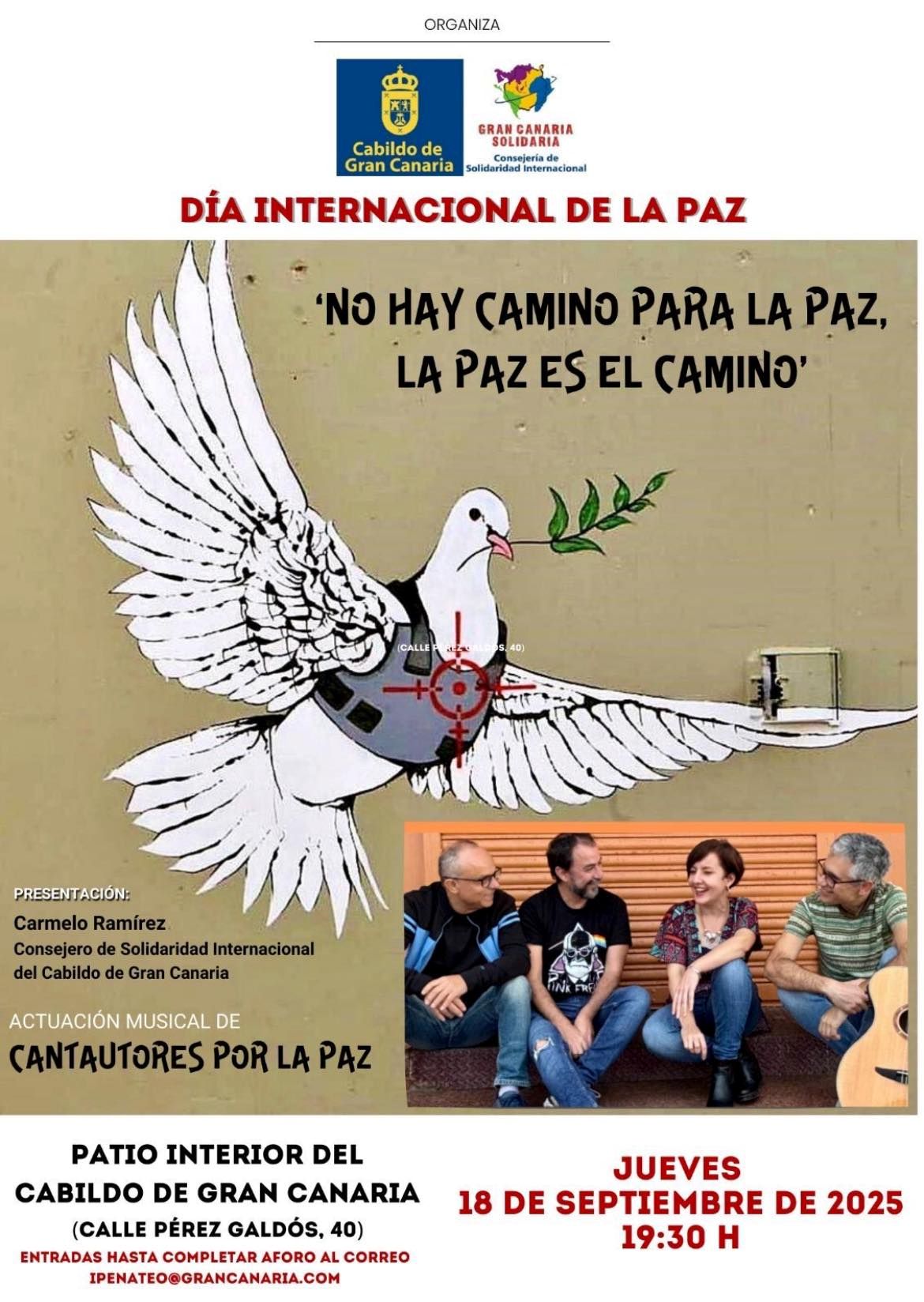Así lo vivimos el jueves 18 de septiembre en el Patio del Cabildo de Gran Canaria, en el marco del Día Internacional de la Paz, con el concierto de Cantautores por la Paz. Las voces de Sara Brito, Daniel Cano, José Artiles, Domingo Quintana Rivero y la percusión vibrante de Frankie Sosa llenaron el espacio de poesía, ternura y rebeldía. La música, ese idioma universal, se convirtió en un puente que une la dignidad de los pueblos con la certeza de que otro mundo es posible.