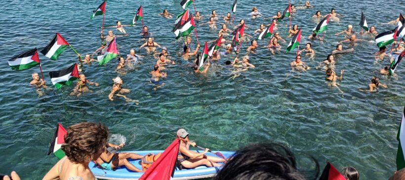La arena, la brisa y el eco de las olas amplificaron las consignas: “No es una guerra, es un genocidio”, “Dónde están, no se ven, las sanciones a Israel”, “Todas somos Gaza, Todas somos La Flotilla”, “Sin solidaridad, no hay humanidad”, “Israel asesina, Europa patrocina”, “Desde el río hasta el mar, Palestina vencerá”.
