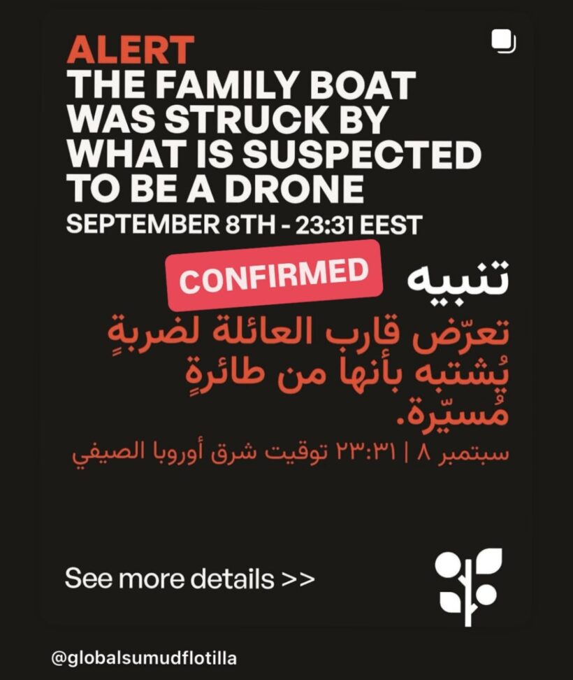 La Global Sumud Flotilla (GSF) Ha sido atacada con un dron en aguas de Túnez. La embarcación afectada, conocida como Family Boat o Familia Madeira, navegaba bajo bandera portuguesa y transportaba miembros del comité de dirección como Greta Thunberg o Thiago Ávila entre otros.