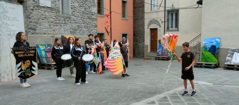 La tarde comenzó con un vibrante espectáculo de bienvenida ofrecido por los Sbandieratori di Gallicano (jinetes de banderas de Gallicano), liderados por el presidente Alessandro Pinocci, Andrea Costabile y el fundador Giulio Baldacci, quienes, en la pequeña plaza frente a la biblioteca, dieron un toque de color y tradición a la inauguración de las celebraciones.