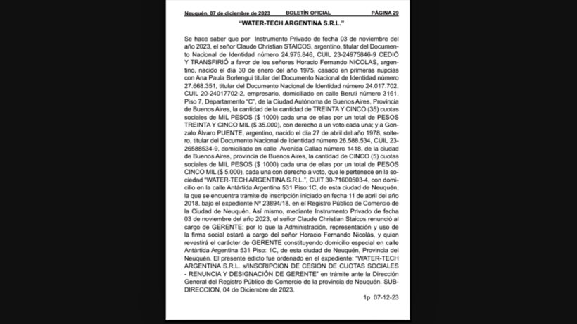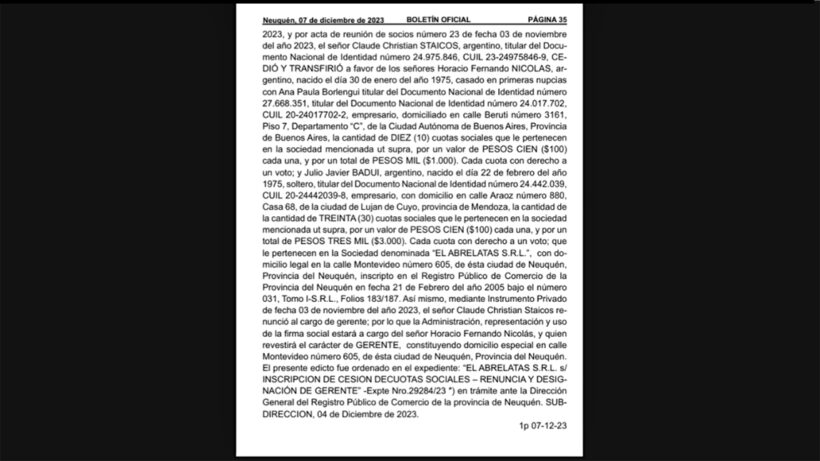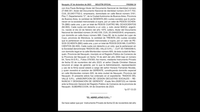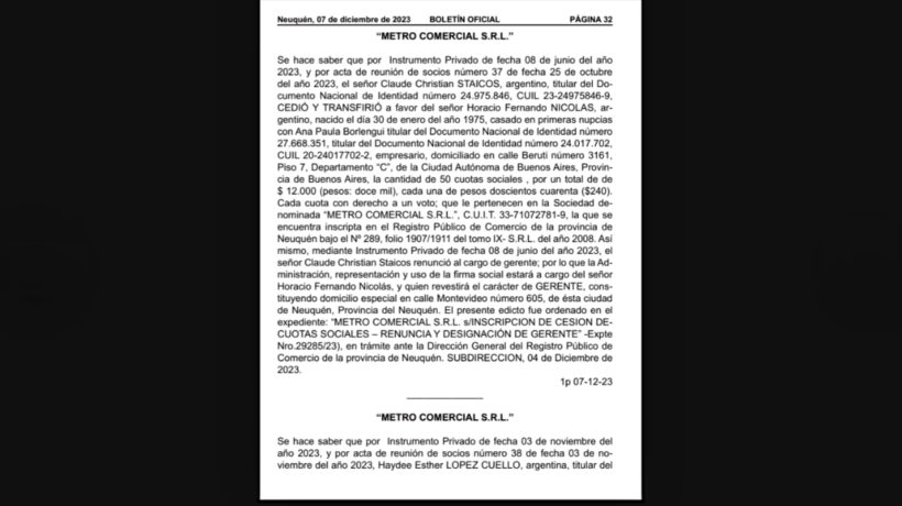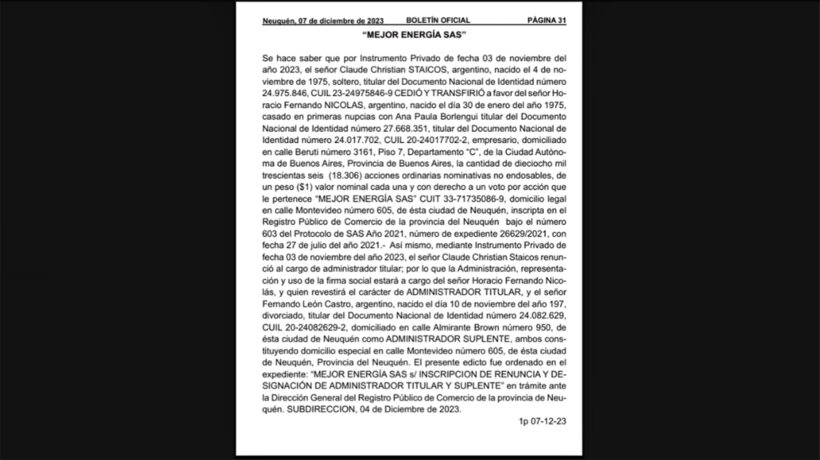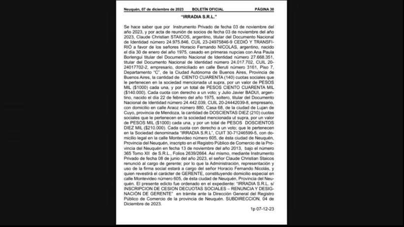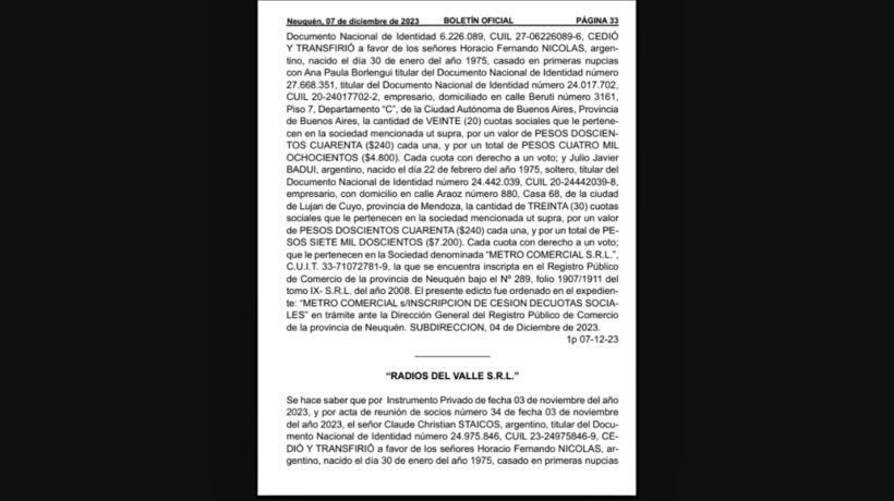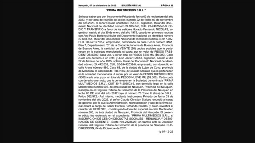 En un movimiento muy sospechoso, con fecha del 3 de noviembre 2023, Claude Staicos transfirió, a nombre de Horacio Fernando Nicolás, todas las empresas que figuraban a su nombre hasta ese momento. Un movimiento ágil y sigiloso que fue detallado en el boletín oficial de la fecha: “Water Tech Argentina S.R.L.”, “Irradia S.R.L.”, “Mejor Energía SAS”, “Metro Comercial S.R.L.”, “Radios del Valle S.R.L.”, “El Abrelatas S.R.L.”, “Prima Multimedios S.R.L.” El 10 de diciembre de 2023 Claude Staicos asumió como secretario de Prensa y Comunicación. ¿Quién es Horacio Nicolás? ¿De qué forma se puede deteriorar la ética informativa, el acceso a la información de calidad, la integridad de los datos, ante esta perniciosa concentración y acaparamiento de medios?