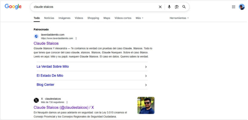 1) Una página oficial con el título «laverdaddemilo.com«. 2) Una cuenta oficial de X (https://x.com/claudestaicos?lang=es) donde se difunden actos políticos y públicos del gobierno provincial de Neuquén, con las últimas acciones públicas del gobernador Rolando Figueroa: narcomenudeo, Ley 3515, convenio con la empresa Phoenix, homenaje a Juan José de San Martín, avance de la obra de la escuela primaria del barrio Nehuen Che. 4) Siete notas periodísticas de medios alternativos (La Izquierda Diario, Resumen Latinoamericano, Prensa Obrera, ANRed) en donde se pueden leer palabras claves como: «violencia», «violencia institucional», «violencia de género», «secuestro», «abuso de poder», «censura». 4) Once videos donde se difunde el momento exacto en el que un menor de edad es forzado, por parte de agentes estatales de la ciudad de Neuquén, a alejarse de la custodia de su madre (varios de los links que contienen estos videos figuran con el rótulo «Está página no está disponible”).