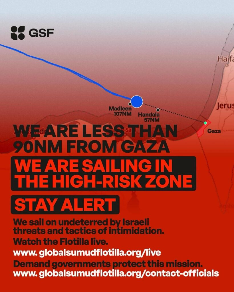 Fue una vigilia forzada, en tensión permanente. Los tripulantes enfrentaron el miedo con disciplina, aplicando protocolos de seguridad mientras documentaban cada movimiento sospechoso. La fatiga física y emocional es evidente: están agotados, pero mantienen el rumbo, decididos a llevar ayuda humanitaria a Gaza y a romper el bloqueo ilegal que asfixia a más de dos millones de personas.