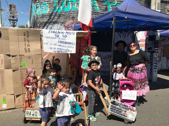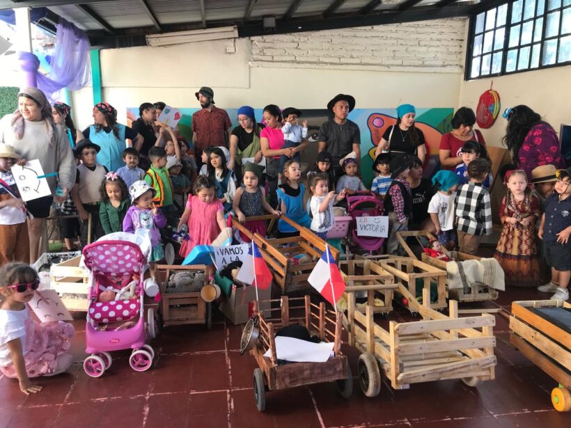 Ronald, quien llegó hace cinco años del Perú, es padre de una niñita de tres años, alumna del Jardín. En el Perú fue técnico de iluminación cinematográfica; en Chile vende cosas en la feria libre para mantener el hogar que comparten ocho familiares. Observa a los pequeños – bigotes pintados en sus rostros y vestidos a lo antiguo, empujando carretones diminutos fabricados por los respectivos padres y madres. Dice: “Vivir en este barrio es para mí una experiencia nueva y bonita. Como tenemos una hijita chilena, nos sentimos parte de esa época también”.