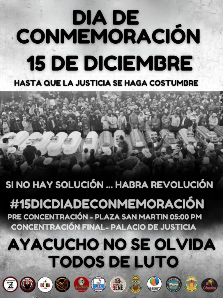 Bajo la letra de Martina Portocarrero con su emblemática “Flor de retama”, el lunes 15 de diciembre (15D) se recordó tres años de la muerte de 10 ciudadanos ayacuchanos (en el sur del país) asesinados por el Ejército, durante la represión militar de 2022, luego del golpe de Estado en el que se encarceló al ex presidente Pedro Castillo. Entre Diciembre de 2022 y Marzo de 2023 alrededor de 1500 personas fueron heridas y 50 perdieron la vida.