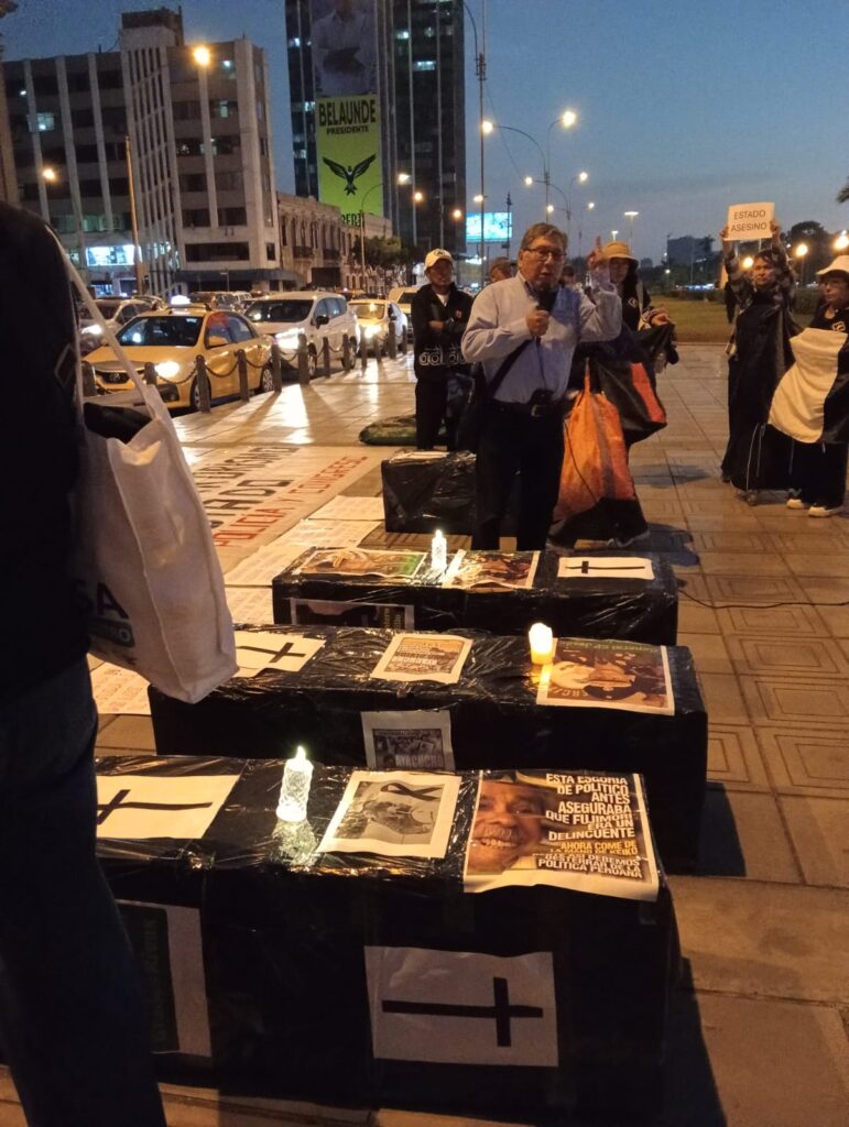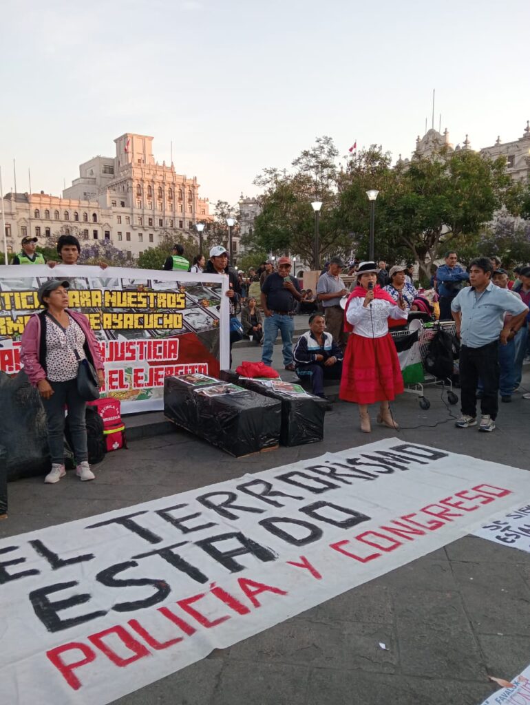 ¡Presente! Gritaban los manifestantes al nombrarse cada ayacuchano caído: Josué Sañudo Quispe, Clemer Fabricio Rojas, Jhon Jennry Mendoza Huarancca, Luis Miguel Urbano Sacsara, José Luis Aguilar Yucra, Edgar Wilfredo Prado Arango, Raúl García Gallo, Christopher M. R.A., Leonardo David Hancco Chacka y Jhonathan Alarcón Galindo, ¡Presente!