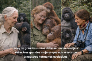 Jane Goodall, con los chimpancés, nos enseñó que comparten emociones, cultura y vínculos profundos. Dian Fossey, con los gorilas, nos mostró el precio de defenderlos sin concesiones. Biruté Mary Galdikas, aún hoy en primera línea en Indonesia, continúa luchando contra la destrucción de los bosques y el exterminio de los orangutanes, enfrentándose a la industria, a la corrupción y a la indiferencia política.