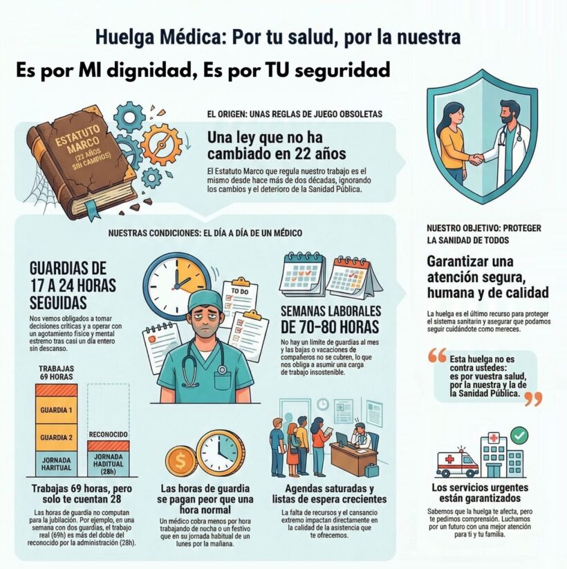 Aquellos que apoyan la huelga señalan un dato sencillo, casi doméstico, pero revelador: hay días en los que un médico acaba su turno y no puede recordar cuándo fue la última vez que durmió ocho horas seguidas. Hay mañanas en las que sale del hospital con la sensación de haber sobrevivido más que trabajado. Hay noches en las que la guardia no se mide en horas, sino en decisiones críticas encadenadas sin respiro.