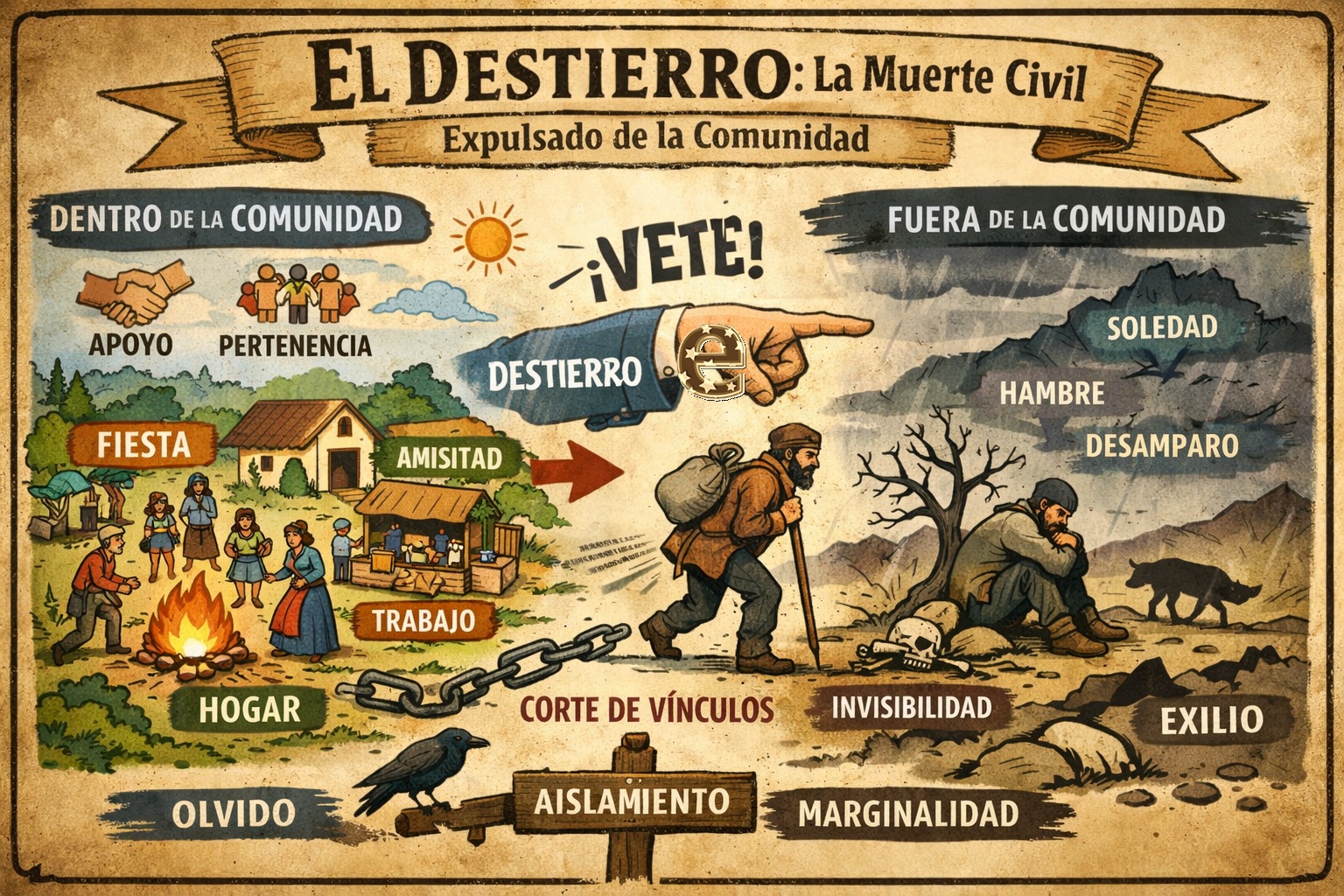 Comparación contextual (destierro medieval ↔ sanciones administrativas modernas) o analogía con figuras históricas, como el destierro medieval o Friedlosigkeit: hoy, cómo en el pasado, los poderes públicos pueden excluir a individuos (personas físicas o jurídicas) fuera de la comunidad política y social, a todos los efectos, En la UE la exclusión se hace mediante sanciones económicas, congelación de activos y restricciones de movilidad, pero bajo un régimen jurídico codificado y vinculante (por ejemplo, las listas de sancionados de la PESC y su ejecución por actos de la Comisión o del Consejo).